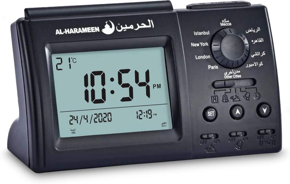 : أوقات الأذان المبرمجة مسبقًا للأوقات العالمية لـ 1150 مدينة، يمكنك برمجة أكثر من 5000 مدينة في جميع أنحاء العالم، 5 مرات أذان كامل تلقائي لجميع الصلوات (مع التحكم في مستوى الصوت) اتجاه القبلة (بالنسبة إلى الشمال) تنبيهات الصلاة لتذكير جميع أوقات الصلاة تنبيه خاص للاستيقاظ لأوقات الصلاة لمعظم مدن العالم؛ إلى استخدام البرمجة بسهولة عن طريق استخدام رمز الهاتف الدولي يمكنه بسهولة تعديل الفرق في وقت الصلاة إلى ضواحي المدن. هناك إمكانية لتشغيل أو إيقاف صوت الأذان بشكل منفصل؛ مستشعر ترموستات مكبران صوت مع مفتاح التحكم في مستوى الصوت لوحة تحكم كاملة التقويم الهجري والميلادي خيار التوقيت الصيفي وخيار الغفوة. تستخدم إضاءة خلفية LED كاملة الشاشة من الحرمين نظام التقويم المحلي أو نظام التقويم الأكثر استخدامًا لمدينتك. تتوفر أنظمة تقويم معيارية أخرى على النحو التالي: توقيت أم القرى المحلي في المملكة العربية السعودية ودول الخليج وشبه الجزيرة العربية، بالإضافة إلى توقيت الأردن وفلسطين المحلي. المصري والأردني والدول العربية الأخرى : أمريكا الشمالية، والمصرية: جمعية الاتحاد الإسلامية في أمريكا الشمالية، شبه القارة الهندية: جامعة العلوم الإسلامية في أوروبا ومنظمة العالم الإسلامي للدول الأخرى. تأتي من العلامة التجارية الحرمين.