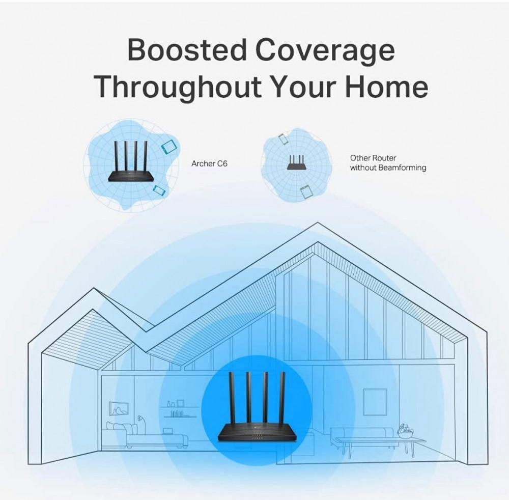 راوتر ارشر سي 6 من تي بي لينك AC1200 بكيبل جيجابت ام يو ميمو، 867 ميجا/ 5 جيجا +300 ميجا في الثانية/ بتردد 2.4 جيجا، 4 جيجا منافذ شبكة، يدعم وضع نقطة الوصول، الرقابة الابوية، WIFI للضيوف، في بي ان